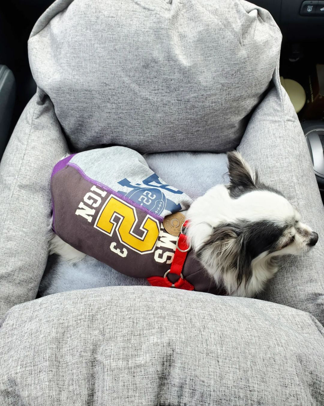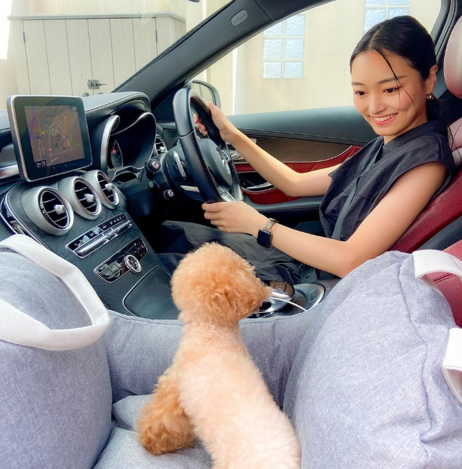 PETTI ゆったりわんちゃんシート💓』下手っぴなねーねの運転でも安全に、そして快適にジルたんをサポートしてくれます☺️ふわふわで乗り心地が良いみたいで、ジルたんもご覧の通り、リラックス😄車の乗り降りの時はそのままバッグとして👜使えるので便利です🙆♀️